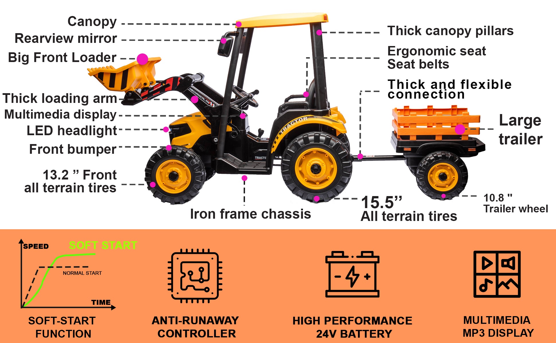 Believe in your choice, no child can resist construction vehicles, you can choose one option from this 24v kids ride on toys: a 3-in-1 tractor, or a tractor with a front loader, or a tractor with a trailer.