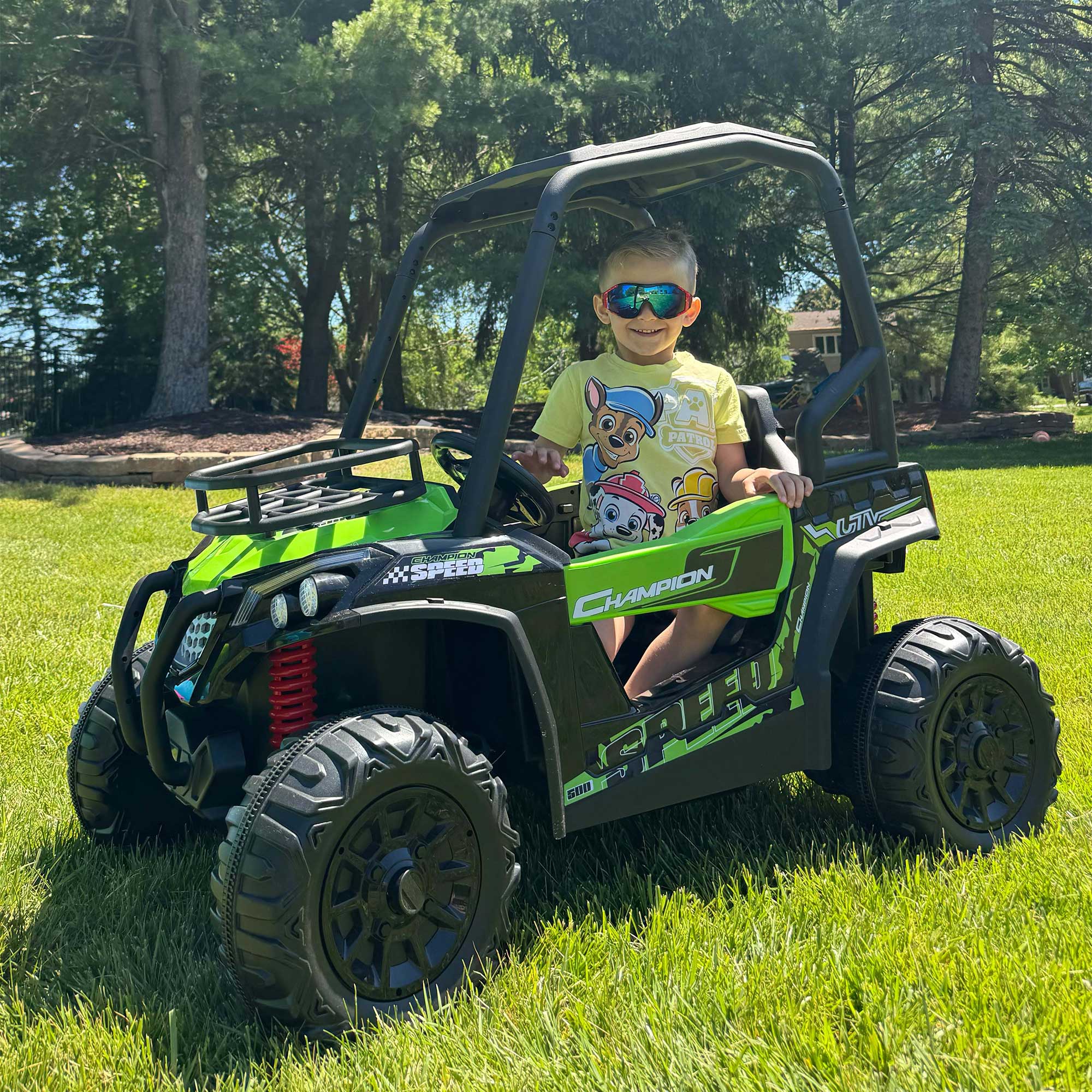 - 🚗【Funny Driving Experience】Turn on the power switch, this 24v ride on toys allows children to control it freely with thesteering wheel and the foot pedal inside, select two High / Low speed / Backward, and then press the foot pedal to provide your child with a speed of 2.5-5 miles per hour. Your children can have an amazing driving experience. Let their imagination roam free!