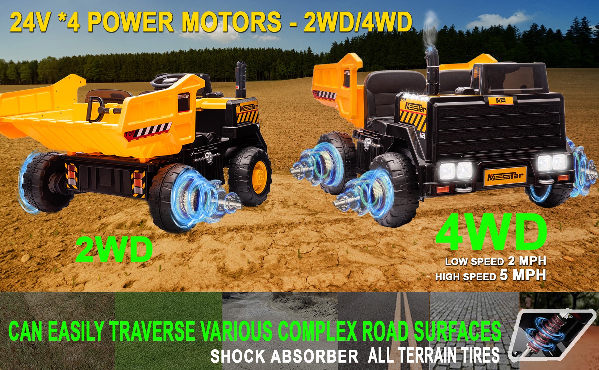 - 【24V Battery & 4x4 Powerful Motors -Powerful Performance】This 24V kids' electric vehicles powered by a genuine 24V battery. Four stage gearbox can effectively increase the vehicle's passability on complex road surfaces, making it more stable than a three-stage gearbox.The Power Wheels upgraded 4WD 400W motors deliver enhanced power. Younger children can use 2WD and low speed to adapt to the car first, then choose the more powerful 4WD and high speed, enabling kids to enjoy different driving fun in 4WD or 2WD mode. The maximum speed can reach 5 miles per hour. And it has good passability.