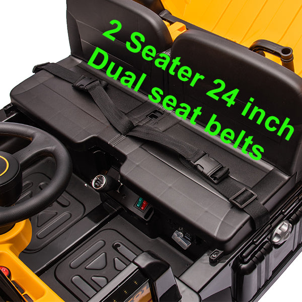 - 【24v Ride On Toys for Big Kids - Safety First 】Our ride on dump truck with remote control features a real 2 seater- 24'' wide , roomy space ensures a comfortable riding experience for for 2 kids ages 3 to 8. And with adjustable seat belts to keep them safe. The co-pilot also has a safety passenger seat handle. Soft start function for smooth acceleration.. The anti-runaway controller (active defense controller) can effectively control the vehicle to prevent loss of control. CPSIA ASTM-F963 safety certification. Your kids will enjoy a comfortable and spacious ride in this 24V ride-on car.
