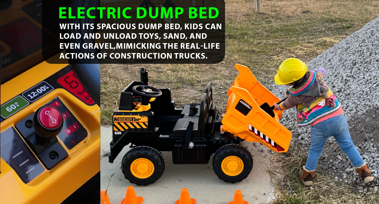 Bring the excitement of a construction site to your backyard with the Kidsera 24V 2-Seater Kids Ride-On Dump Truck! This battery-powered electric vehicle is similar to popular power wheels, but It has more advanced design concepts and is designed to spark your child's imagination and encourage outdoor play, all while providing a safe and fun experience. Perfect for kids who love construction, whether they're boys or girls, ages 3-8.
