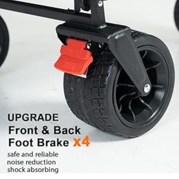 - Folding Wagon with Big Wheels: The large wide all terrain wheels suit different road surfaces,such as mud,sand,gravel roads,beach, etc. And the wheel size is 4" wide and 7" diameter, the front wheels can rotate 360 degrees,easy to go ahead and turn around. Whichever direction you want to go,you'll have no trouble wheeling this cart around.